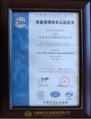 多年來,公司秉承質量優先、誠信為本的經營宗旨,嚴格按照ISO9001- 2000標準組織生產運營,為顧客提供良好的產品、滿意的服務,已經取得德國 TUV9001-2000質量體系認證書,獲得鍛造壓力容器法蘭制造許可證,真誠期盼與 國內外客戶攜手合作,共同開創鍛件市場的輝煌未來。